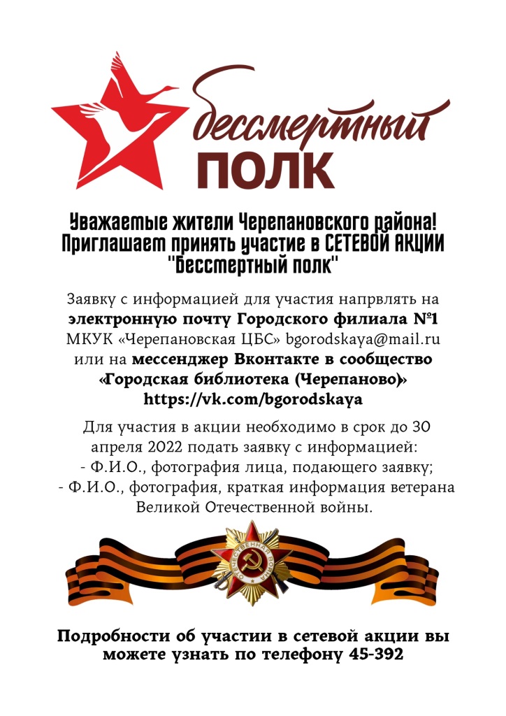 Уважаемые жители Черепановского района, приглашаем принять участие в сетевой акции "Бессмертный полк" Узнать подробнее об акции можно скачав Положение о сетевой акции "Бессмертный полк". Или по телефону 45-392, Городская библиотека.
