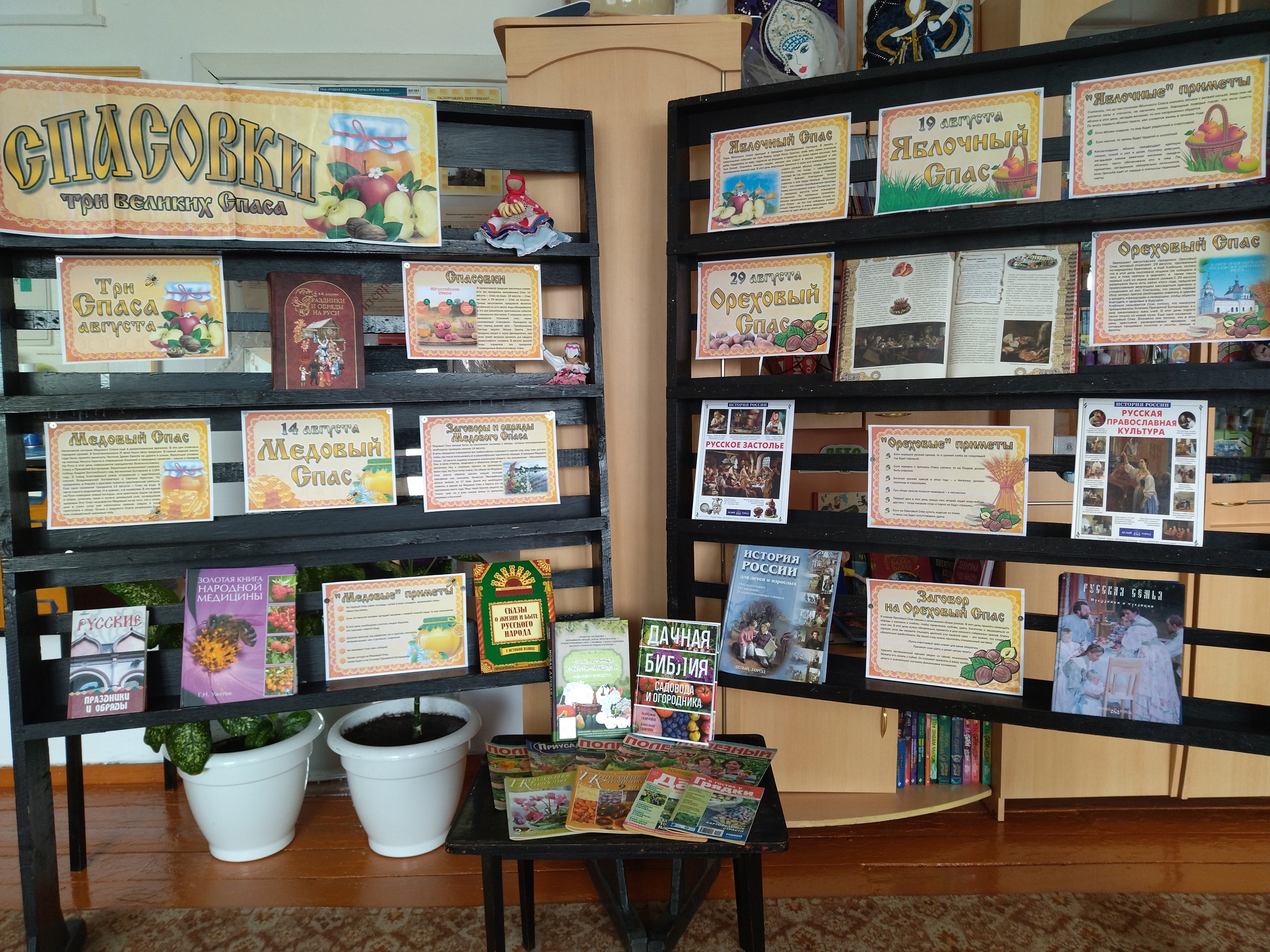 Из материалов выставки читатели могли узнать, что Медовый Спас приходится на 14 августа, Яблочный на 19 августа, а Ореховый на 29 августа. Интерес вызвали обычаи крестьянского быта, обряды, приметы, гадания, соответствующие каждому Спасу.