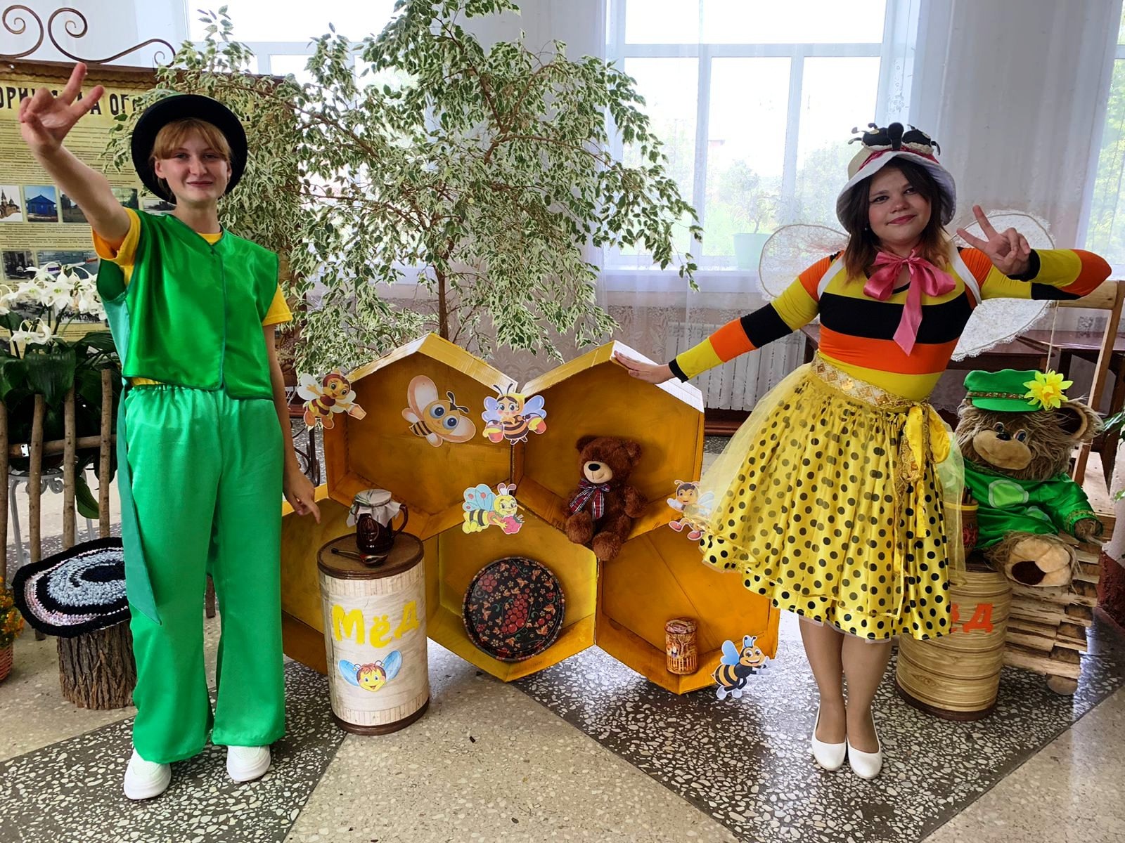 На импровизированной полянке фойе Дома культуры гостей праздника встречали кузнечик Кузя со своей подругой пчёлкой Жужу. Они предложили детям забавы, игры, танцы.