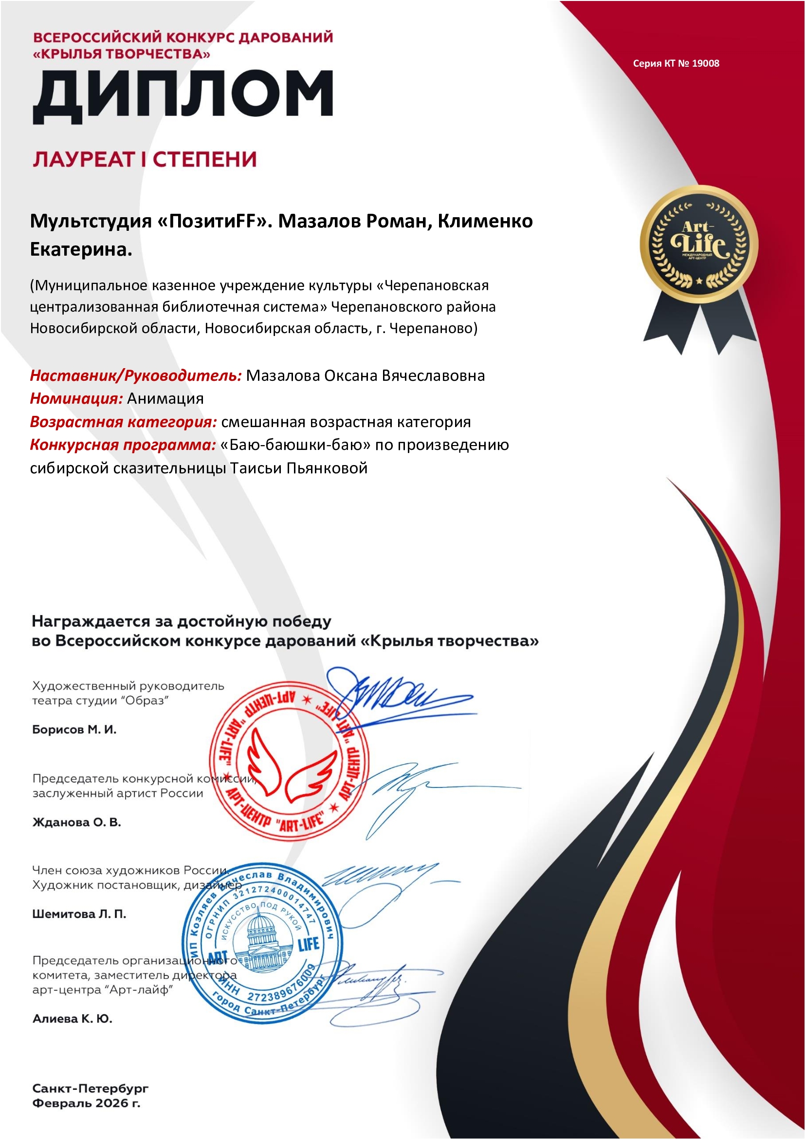 И знаете что? Наша работа не осталась незамеченной! Мы уже получили второе место на Областном конкурсе "Светелка творчества Таисьи Пьянковой", а сегодня – просто бомба! На Всероссийском конкурсе дарований "КРЫЛЬЯ ТВОРЧЕСТВА" наш мультфильм стал ЛАУРЕАТОМ I степени!