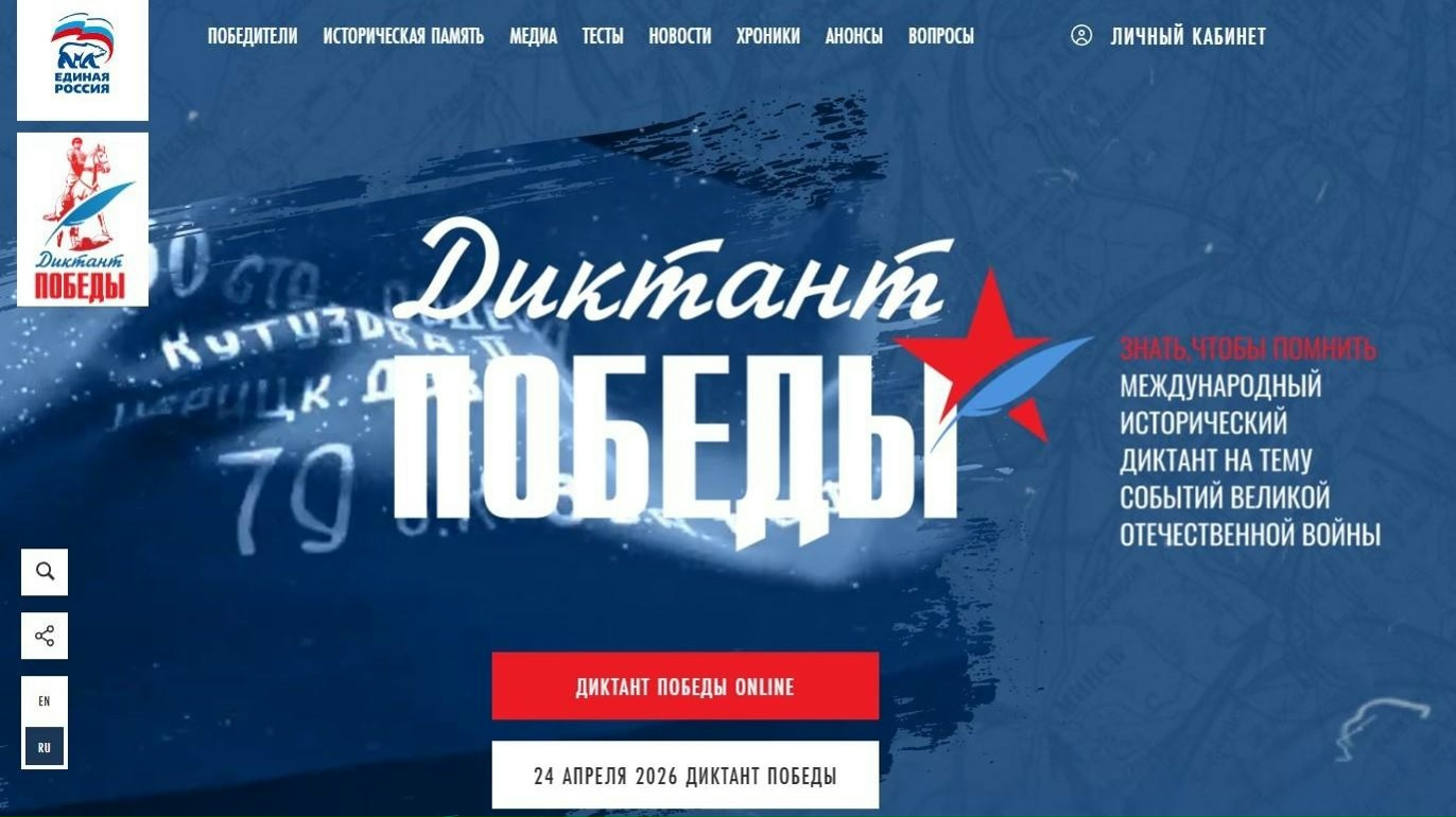 Желающие проверить свои знания по истории и подготовиться к предстоящему «Диктанту Победы» могут воспользоваться онлайн-ресурсами на официальном сайте dictantpobedy.ru/. В разделе «Тесты» (dictantpobedy.ru/tests?type...) доступны тренировочные задания.
